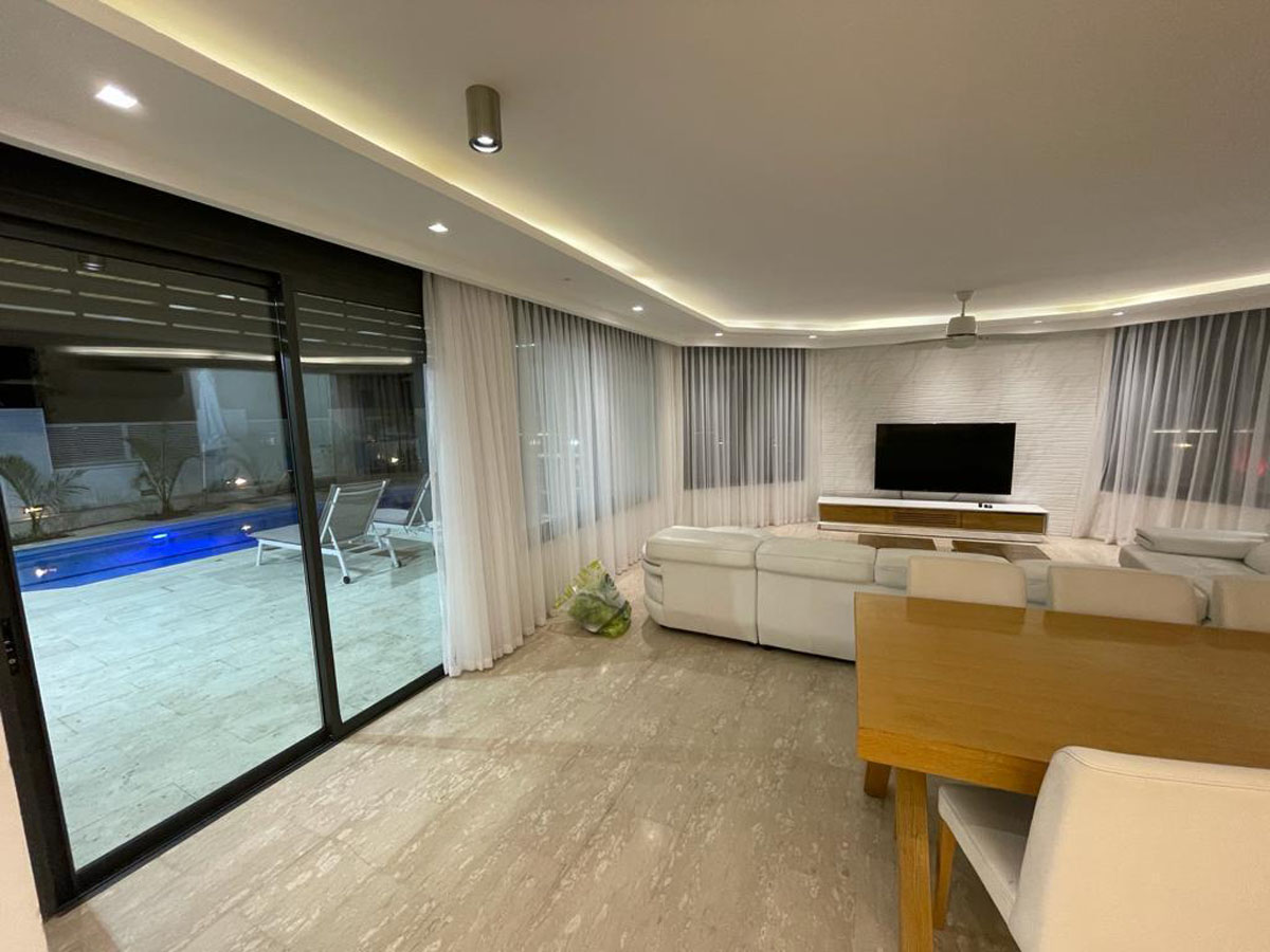 סלון גדול במיוחד הצופה לבריכה ומטבח מאובזר מא' ועד ת' (כולל תנור, כיריים ומיקרוגל).