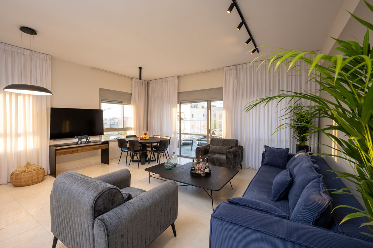 פנטהאוז עוצר נשימה המציע חלוקה חכמה בין אירוח משותף לפרטיות מלאה.