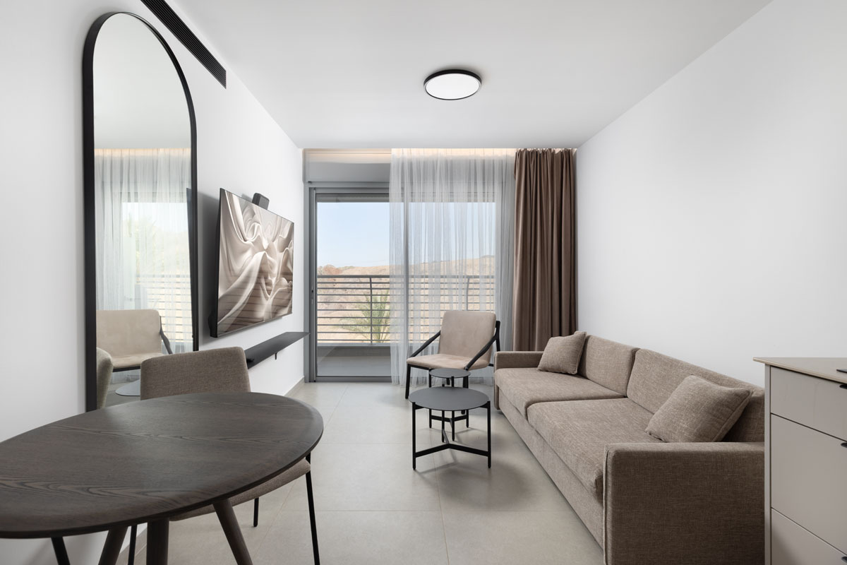 להתנתק מהעולם בסטייל: סוויטה שקטה עם מרפסת הפונה אל פנים המתחם, המעניקה תחושת אינטימיות ורוגע. הדירה צמודה ל-Desert View ומציעה אבזור פרימיום מלא למשפחות או קבוצות חברים שרוצים לנפוש זה לצד זה בסטנדרט הגבוה ביותר.